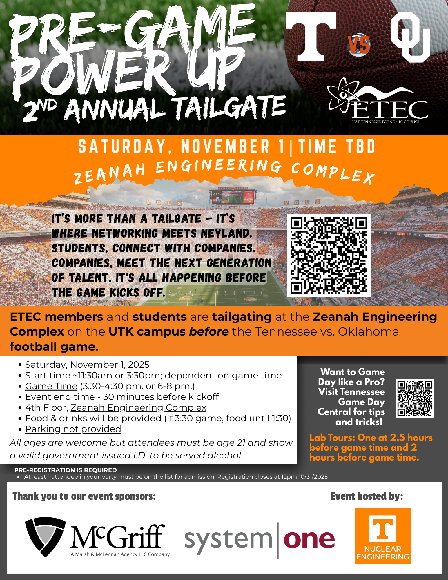Join ETEC members at the Zeanah Engineering Complex on the UTK campus for a fun Pre-Game Power Up tailgate before the Tennessee vs. Oklahoma football game. Networking with companies and students, Food, Drinks, Nuclear Engineering Lab Tours. Thanks to McGriff and System One for sponsoring. We have space for one additional sponsor, contact Hailey@eteconline.org if you are interested. Click here for more information.