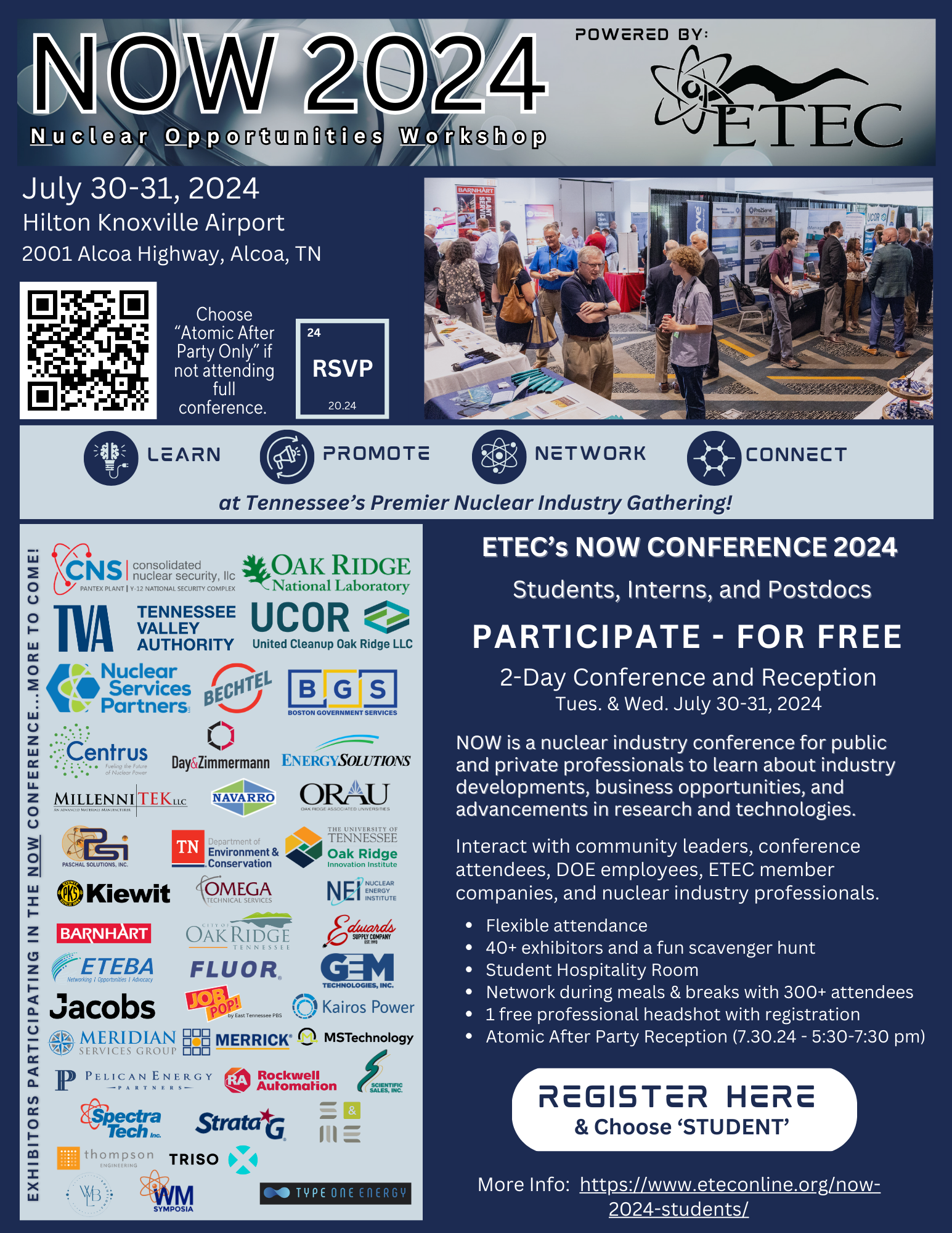 ETEC invites all students, interns, and postdocs to attend our 6th Annual Nuclear Opportunities Workshop (NOW Conference) on July 30-31, 2024, at the Hilton Knoxville Airport for FREE. If you have summer interns at your company please let them know they are welcome to attend.