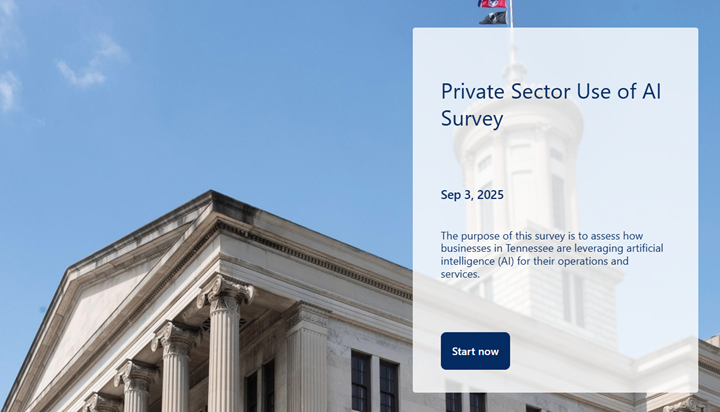 Click here to take a short survey from the Tennessee AI Advisory Council at the State of Tennessee. The purpose of the survey is to assess how businesses in Tennessee are leveraging artificial intelligence (AI) for their operations and services. By completing the survey, you will help inform the Council’s recommendations for sound policies and strategies regarding AI use and adoption.