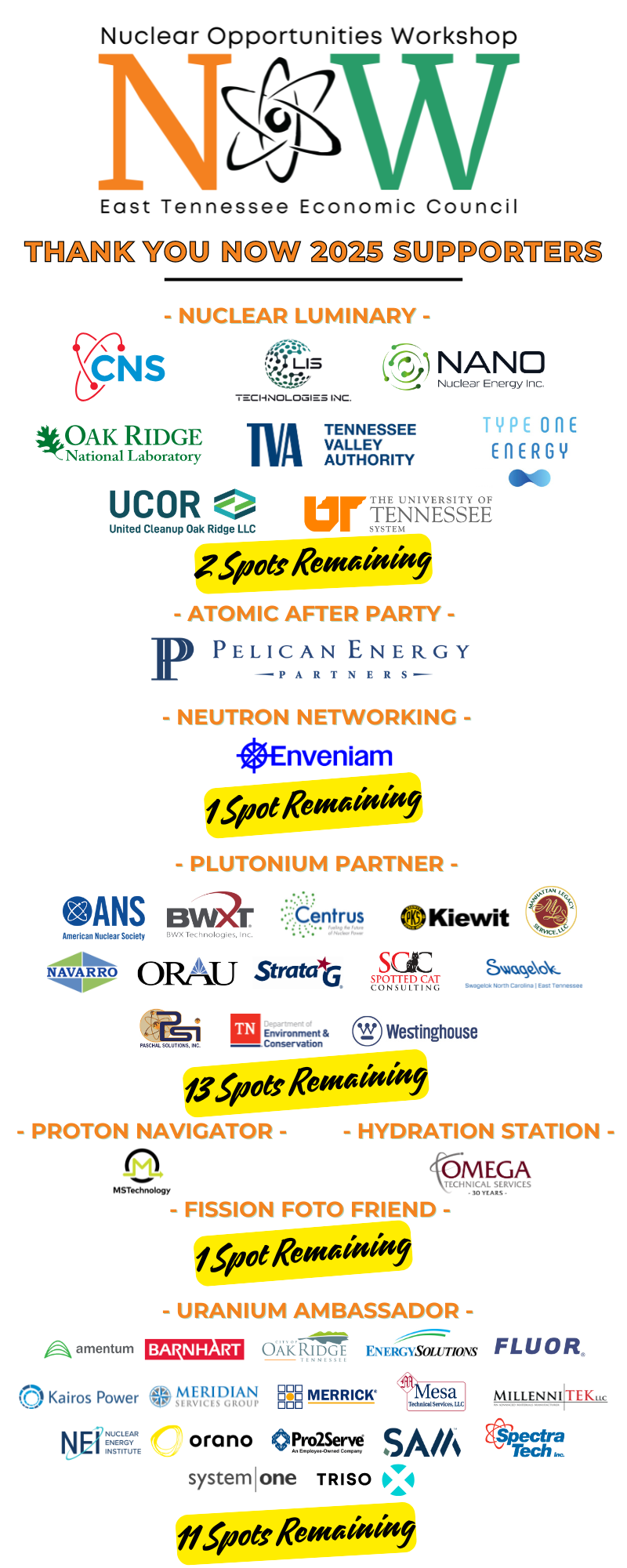 Join us for ETEC's 7th Annual Nuclear Opportunities Workshop (NOW Conference), an annual nuclear industry conference focused on all aspects of the nuclear industry for professionals, suppliers, and students held in the Oak Ridge Corridor of Tennessee at the Knoxville Convention Center. Click here to register to attend.