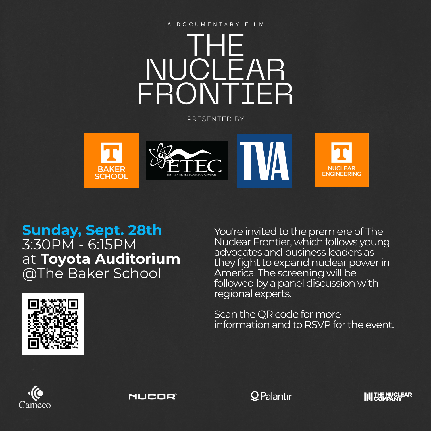 Join the University of Tennessee at the Toyota Auditorium at the Baker School for a screening of The Nuclear Frontier followed by a panel discussion. This exciting new documentary explores the growing need for energy in the U.S. and how nuclear can meet this demand with resilient, stable, baseload energy. The panel will engage academics and industry professionals in a discussion about nuclear technologies, academic-industry collaborations, and where our energy future is headed.