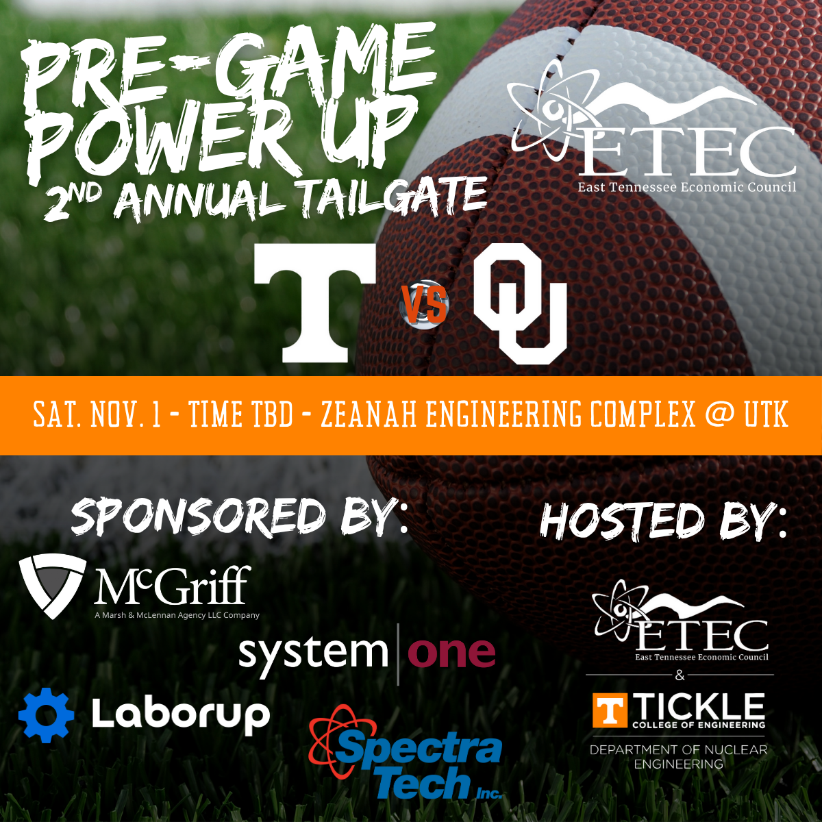 Join ETEC members at the Zeanah Engineering Complex on the UTK campus for a fun Pre-Game Power Up tailgate before the Tennessee vs. Oklahoma football game. The event will feature, networking with companies, faculty, and students, food, drinks, and nuclear engineering lab tours. Thanks to Laborup, McGriff, Spectra Tech, and System One for sponsoring and to our co-host the University of Tennessee Department of Nuclear Engineering!