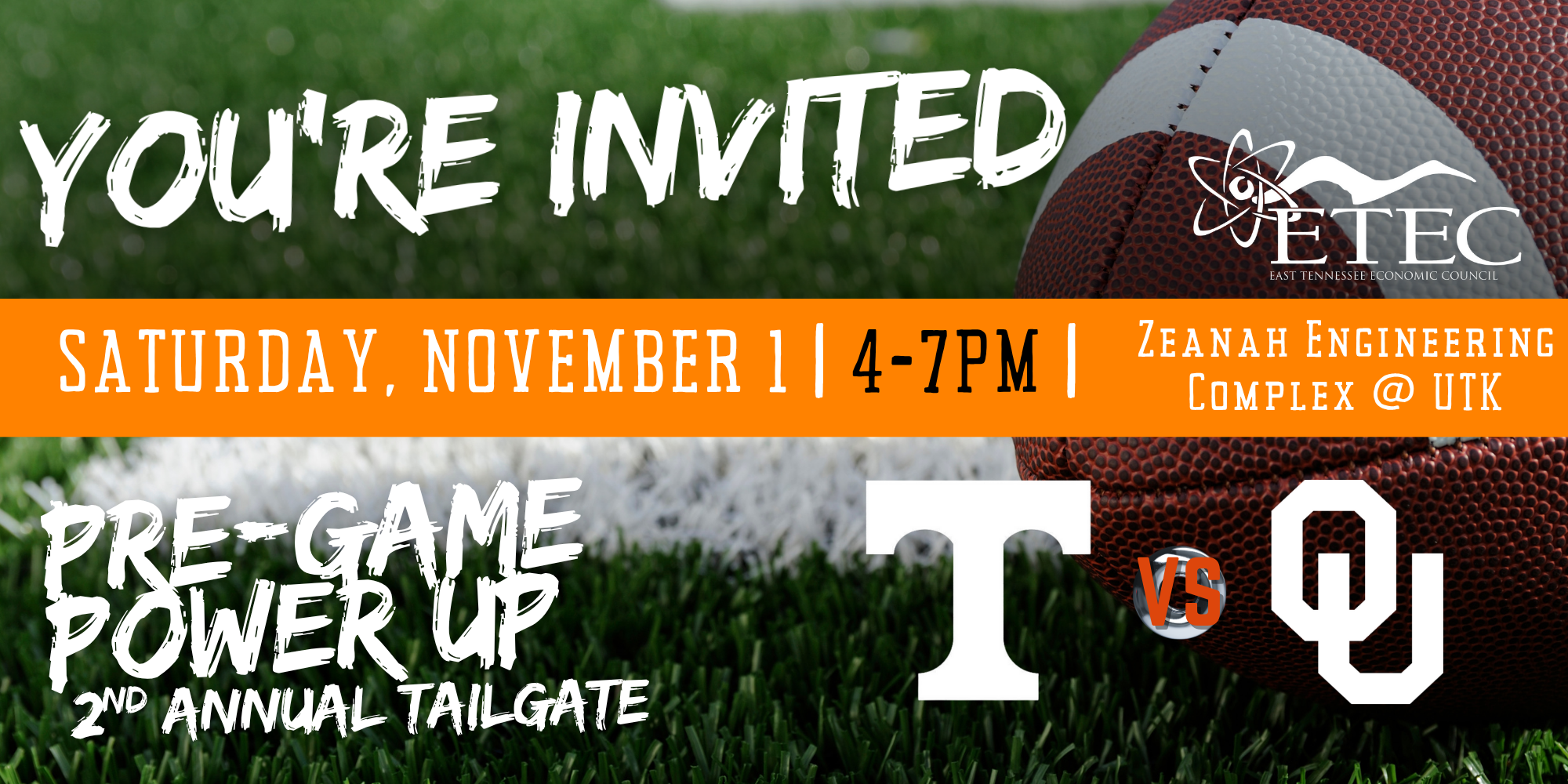 Join ETEC members at the Zeanah Engineering Complex on the UTK campus for a fun Pre-Game Power Up tailgate before the Tennessee vs. Oklahoma football game on Saturday, November 1, 2025 from 4-7PM.