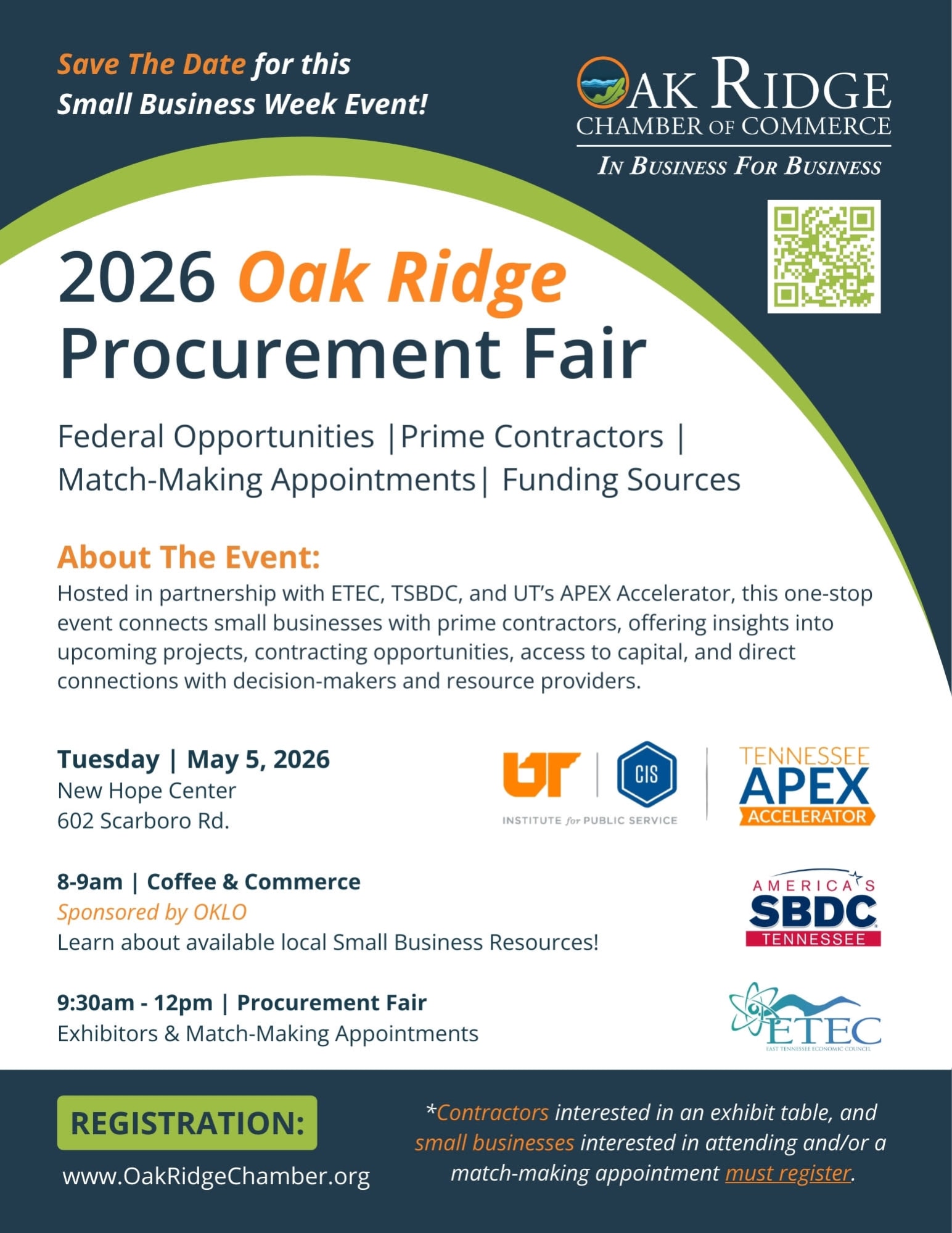 You are invited to be a part of the 2026 Oak Ridge Procurement Fair, organized by the Oak Ridge Chamber of Commerce and hosted in partnership with ETEC, TSBDC, and UT’s APEX Accelerator.