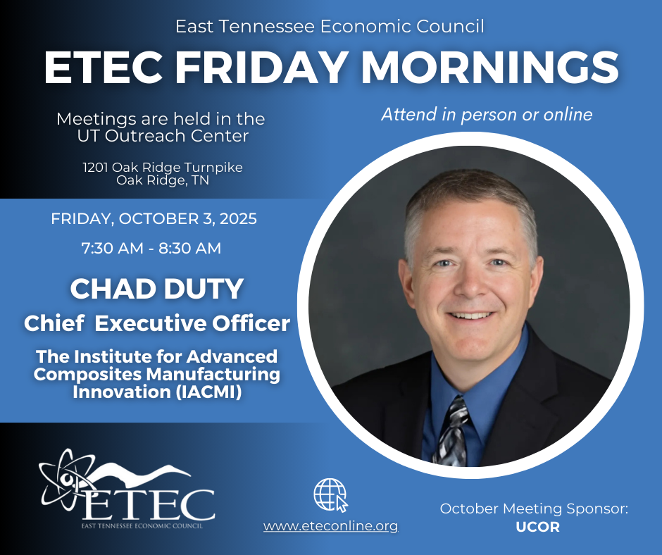 Join us at ETEC in-person or virtually on Friday, October 3, 2025, at 7:30am to hear from Chad Duty, Chief Executive Officer for The Institute for Advanced Composites Manufacturing Innovation (IACMI). More information below.