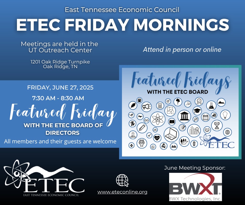 Join ETEC in-person or virtually on Friday, June 27, 2025 at 7:30am for a Featured Friday with the ETEC Board of Directors.