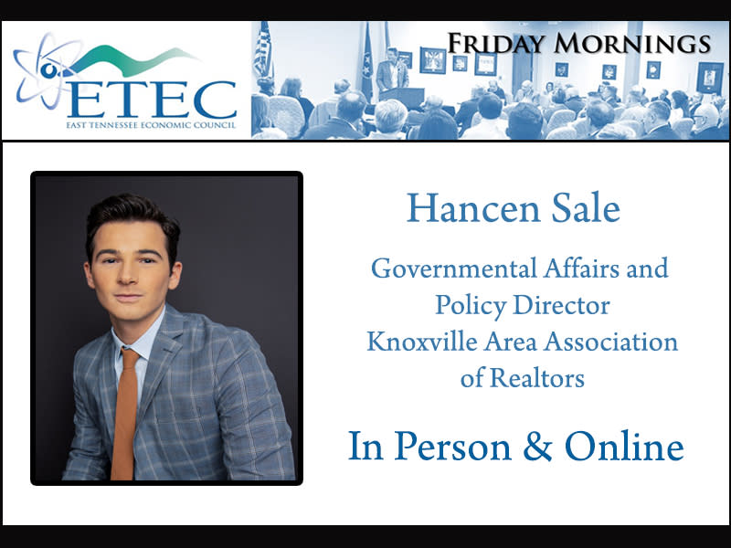 Join us on Friday, May 12, 2023, to hear from Hancen Sale, Government Affairs and Policy Director at Knoxville Area Association of Realtors.