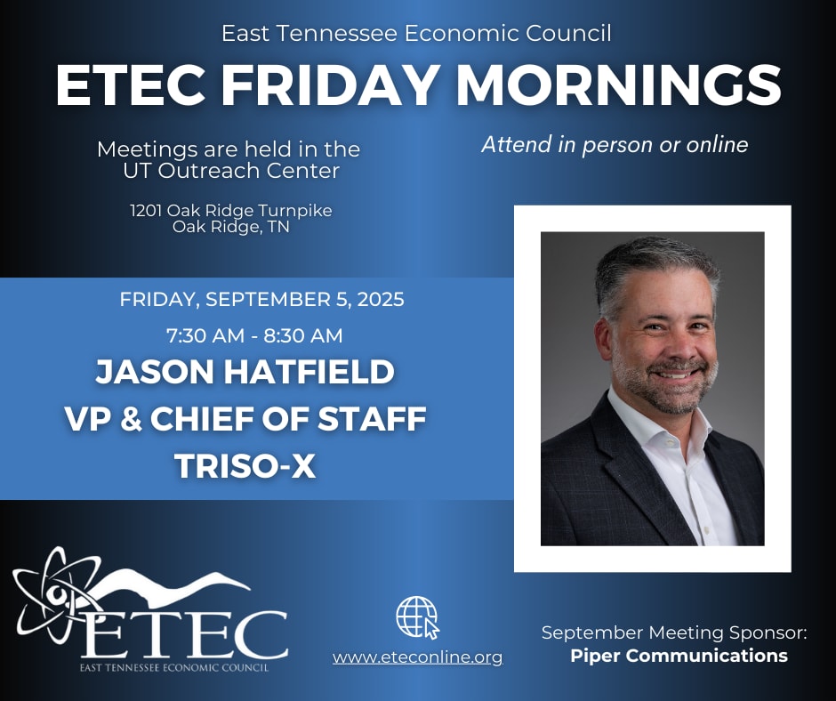 Join us at ETEC in-person or virtually on Friday, September 5, 2025, at 7:30am to hear from Jason Hatfield, Vice President & Chief of Staff at Triso-X. His bio is below.