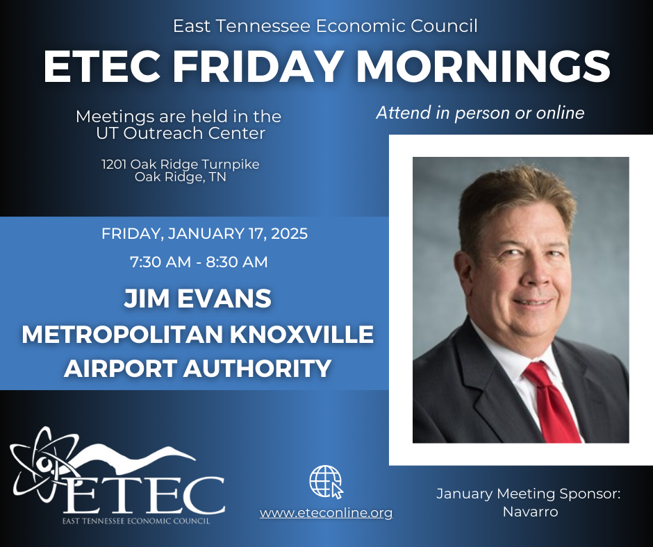 Join us at ETEC in person or virtually on Friday, January 17 at 7:30am to hear from Jim Evans, Vice-President of Marketing & Air Service Development of the Metropolitan Knoxville Airport Authority. The topic for his presentation will be "McGhee Tyson Airport Update". More info is below.