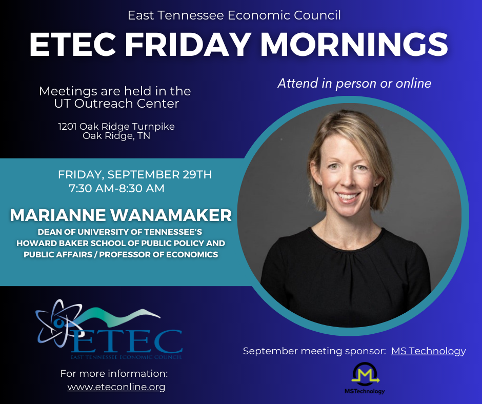 Join us on Friday, September 29th, 2023, to hear from Marianne Wanamaker, Dean of the University of Tennessee's Howard Baker School of Public Policy and Public Affairs and a Professor of Economics.