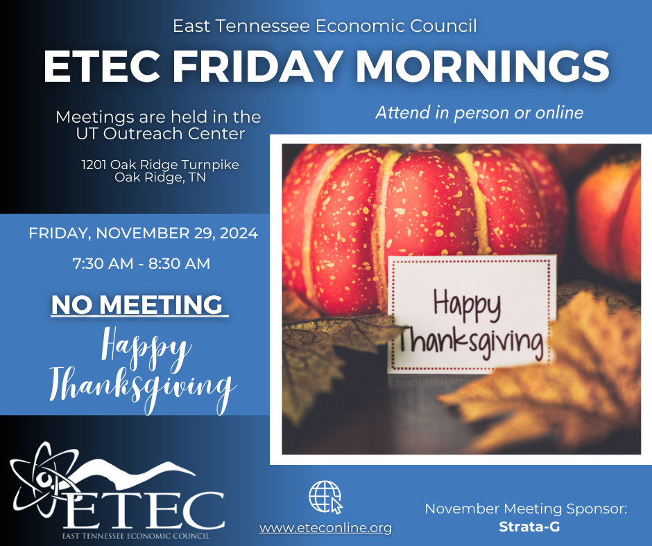 ETEC will not meet on Friday, November 29 in honor of Thanksgiving. See you on Friday, December 6.