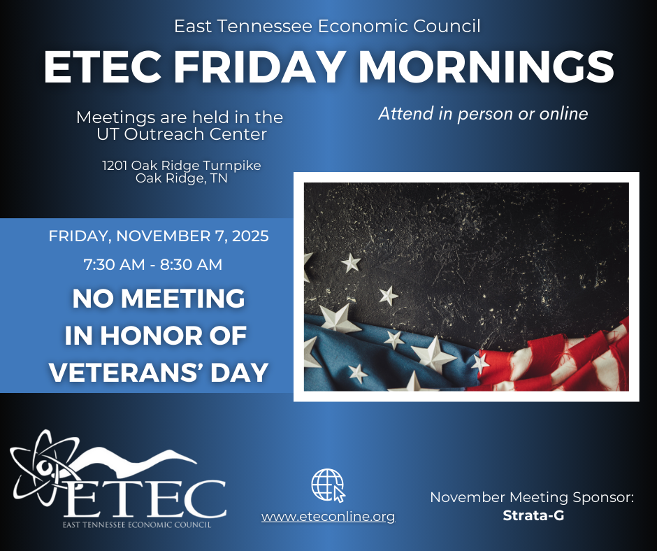 ETEC will not meet on Friday, November 7th, 2025, in honor of Veterans' Day. We will resume our meetings on Friday, November 14th, 2025.