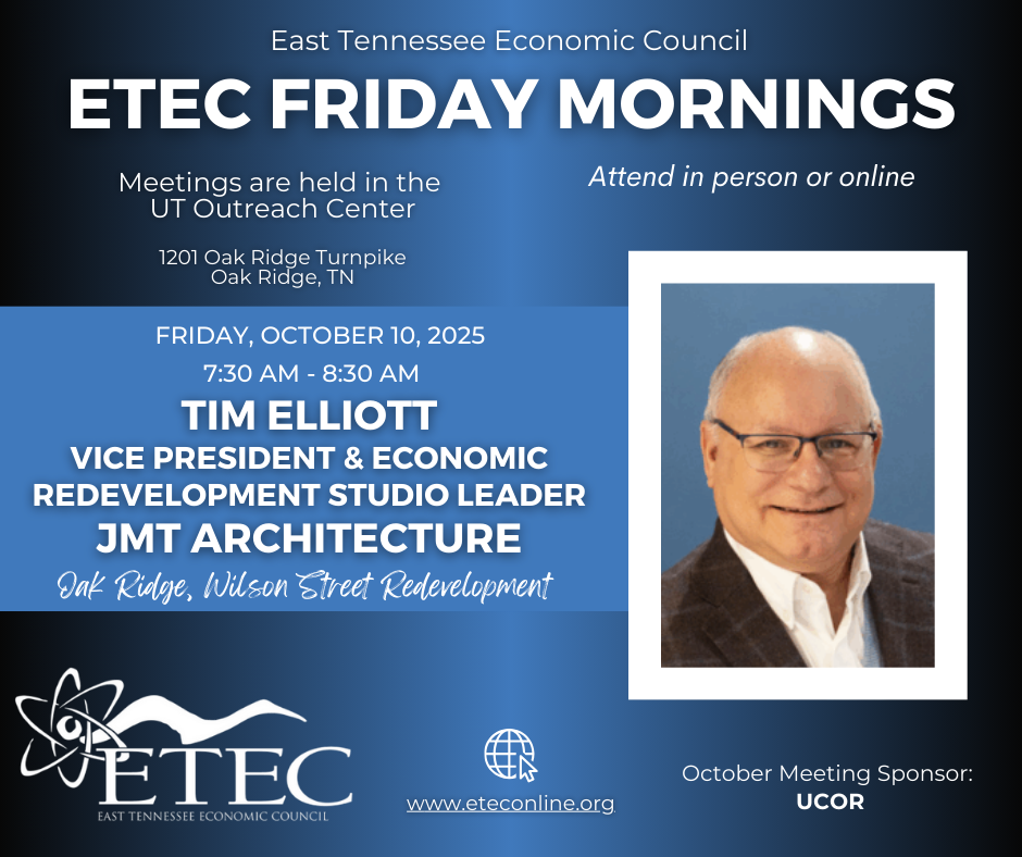 Join us at ETEC in-person or virtually on Friday, October 10, 2025, at 7:30am to hear from Tim Elliott, Vice President of Economic Redevelopment Studio Leader at JMT Architecture. Tim is the developer working on the City of Oak Ridge, Wilson Street Redevelopment. More information below.