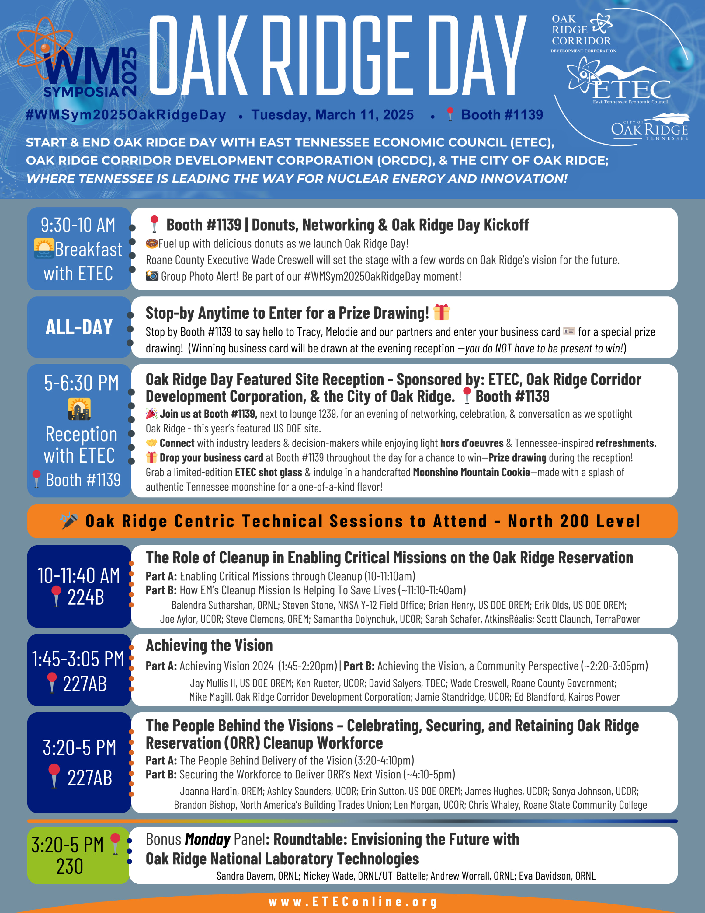Special Focus – Oak Ridge Day (Tuesday, March 11): Oak Ridge has been designated as the U.S. Department of Energy's Featured Site for WM2025. A series of events and technical sessions will highlight Oak Ridge's contributions to the nuclear industry: