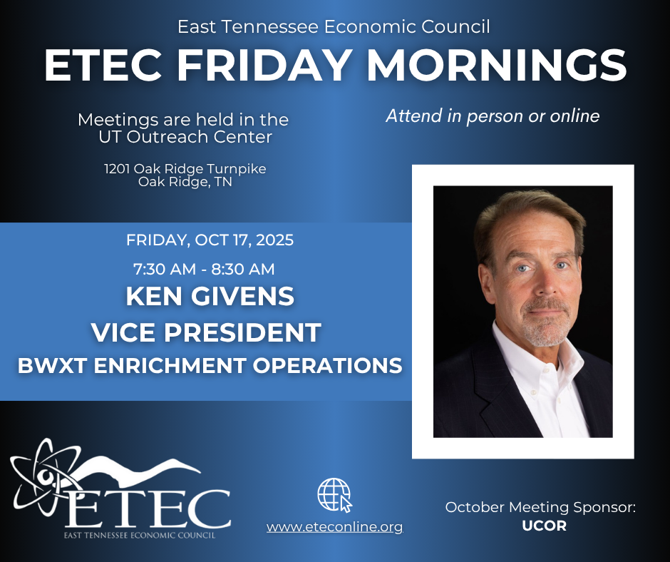 Join us at ETEC in-person or virtually on Friday, October 17, 2025, at 7:30am to hear from Ken Givens, VP of BWXT Enrichment Operations. More information below.