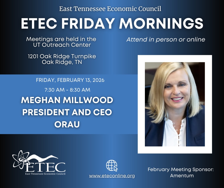 Join us at ETEC in-person or virtually on Friday, February 13, 2026 at 7:30am to hear from Meghan Millwood President and CEO of Oak Ridge Associated Universities (ORAU). Her bio is below.