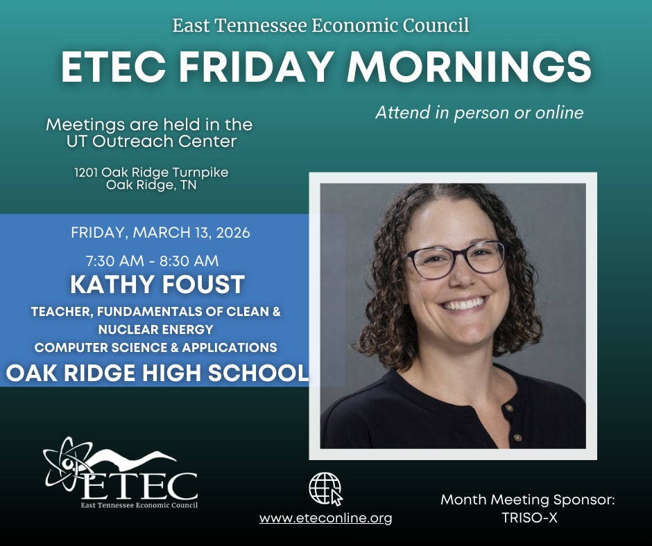 Join us at ETEC in-person or virtually on Friday, March 13, 2026, at 7:30am for an inspiring conversation with Kathy Foust, Teacher of Fundamentals of Clean & Nuclear Energy, Computer Science & Applications at Oak Ridge High School. Kathy, along with three students, will discuss the new Clean and Nuclear Energy Program that launched this year at Oak Ridge High School. This innovative program prepares students for future careers in the energy sector by providing both theoretical understanding of energy production and practical exposure to the industry through engagement with industry partners, right here in our community.