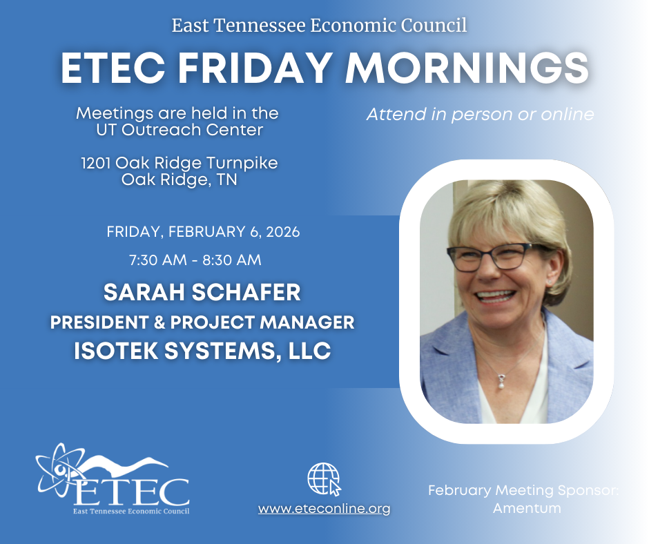 Join us at ETEC in-person or virtually on Friday, February 6, 2026 at 7:30am to hear from Sarah Schafer, President/Project Manager of Isotek Systems, LLC, a member of Atkins Realis.