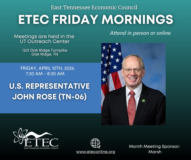 Join us at ETEC in-person or virtually on April 10, 2026 at 7:30am to hear from U.S. Representative John Rose (TN-06), who will provide an update from Washington, D.C., including key developments impacting Tennessee.