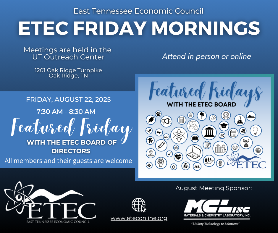 Join ETEC in-person or virtually on Friday, August 22, 2025 at 7:30am for a Featured Friday with the ETEC Board of Directors.