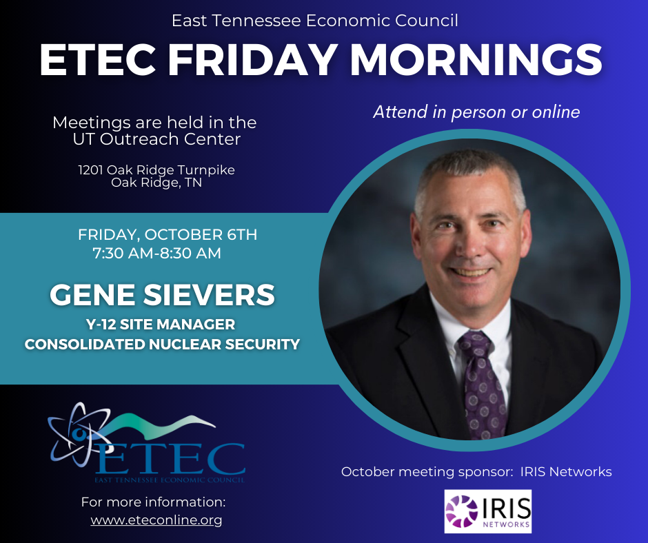 Join us on Friday, September 29th, 2023, to hear from Gene Sievers, Y-12 Site Manager for Consolidated Nuclear Security.