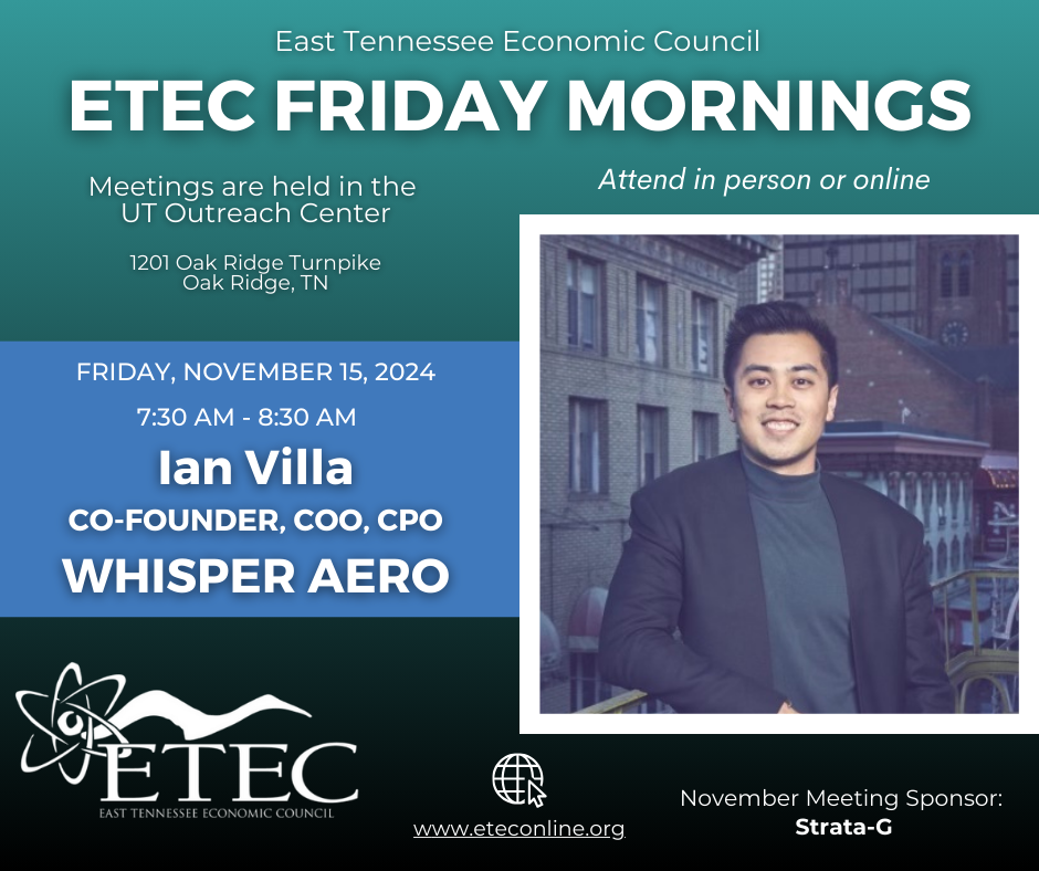 Join us at ETEC in person or virtually on Friday, November 15 at 7:30am to hear from Ian Villa, Co-Founder, COO, CPO of Whisper Aero. Ian plans to focus his talk around what Whisper is and why we’re committed to developing cleaner, quieter, and more efficient propulsion solutions. His bio is below.