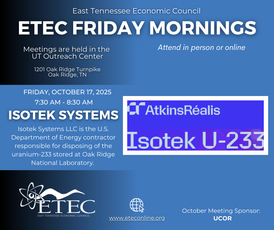 Join us at ETEC in-person or virtually on Friday, October 17, 2025, at 7:30am to hear from Isotek Systems, LLC. Isotek Systems, LLC is a Department of Energy (DOE) contractor under Atkins Nuclear Secured.