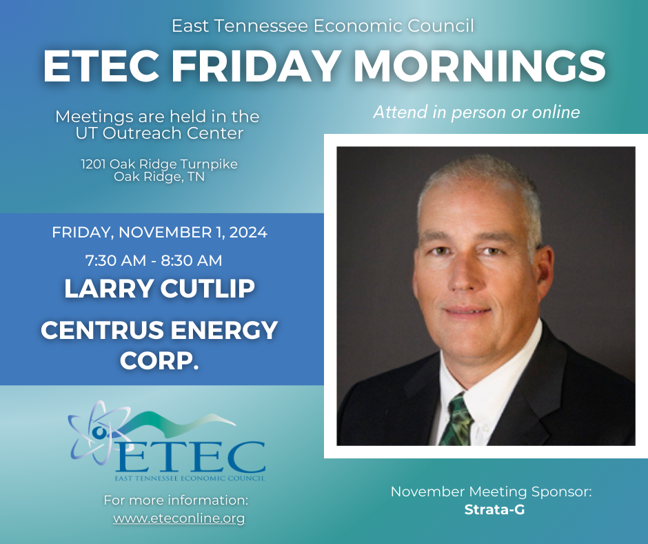 Join us at ETEC in person or virtually on Friday, November 1 at 7:30am to hear from Larry Cutlip, Senior Vice President, Field Operations, for Centrus Energy Corp and President, American Centrifuge Operating, LLC. Larry's bio is below. He’ll be presenting Centrus Energy Corp’s plan for expansion into the enrichment market and the potential impact on the Oak Ridge area.