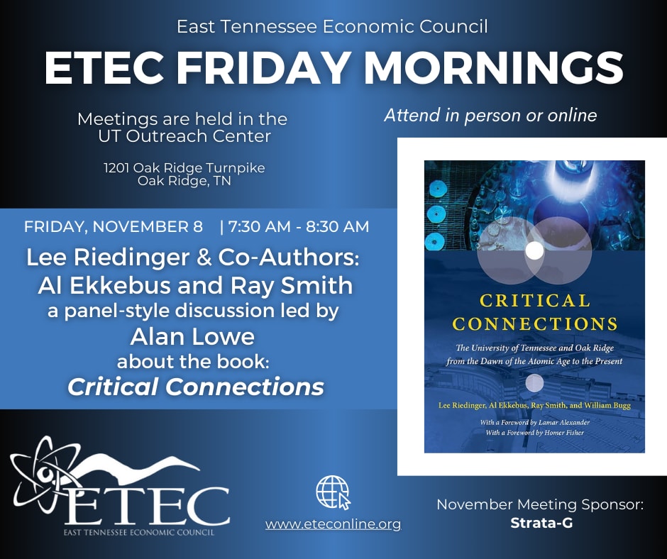 Join us at ETEC in person or virtually on Friday, November 8 at 7:30am to hear from Lee Riedinger and two of his co-authors (Al Ekkebus and Ray Smith), speaking about Critical Connections: The University of Tennessee and Oak Ridge from the Dawn of the Atomic Age to the Present. This will be a panel type program led by Alan Lowe from the American Museum of Science and Energy. Co-author William Bugg will be unable to attend. The book summary and editorial information is below.