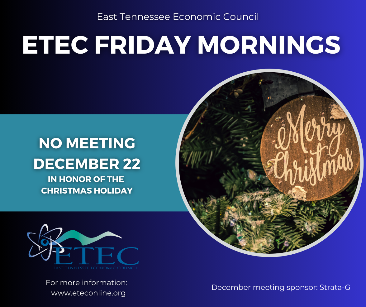 There will not be an ETEC meeting on Friday, December 22 due to the Christmas Holiday. See you on Friday, January 5, 2024! For more details about ETEC's Friday morning meetings visit, https://www.eteconline.org/weekly-meetings-online-in-person/.