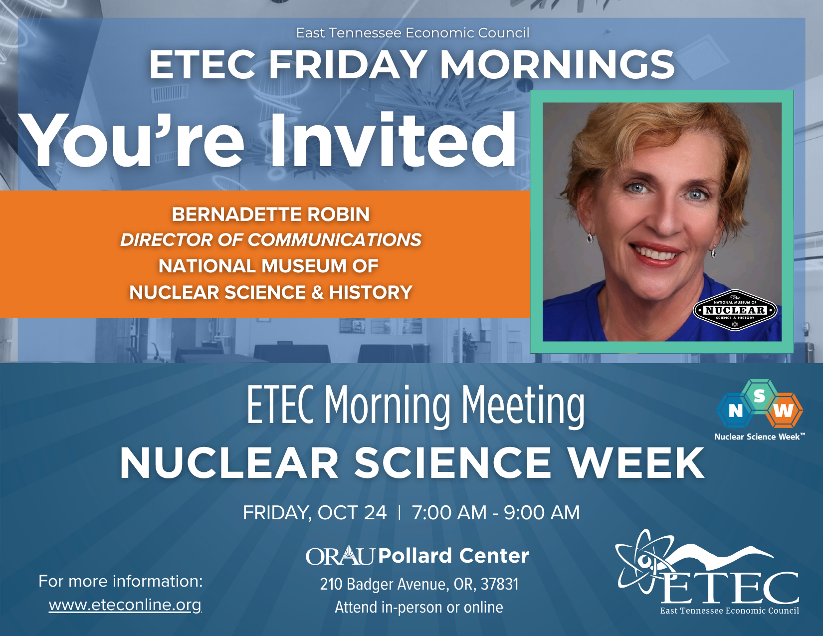 Join us at ETEC in-person or virtually on Friday, October 24, 2025, at 7:00am to hear from Bernadette Robin, Director of Communications for the National Museum of Nuclear Science & History.