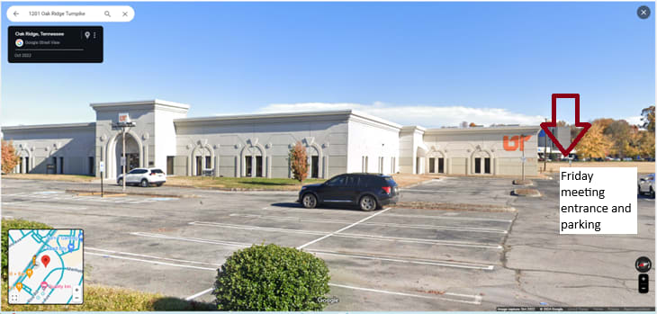 Come to the back corner of the building. The entrance faces the Quality Inn and Applebee's. Look for an awning and sign that says University of Tennessee Outreach Center.