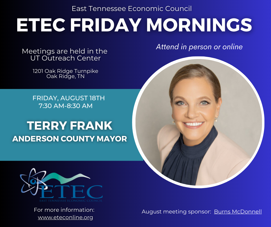 Join us on Friday, August 18th, 2023, to hear from Terry Frank, Mayor of Anderson County